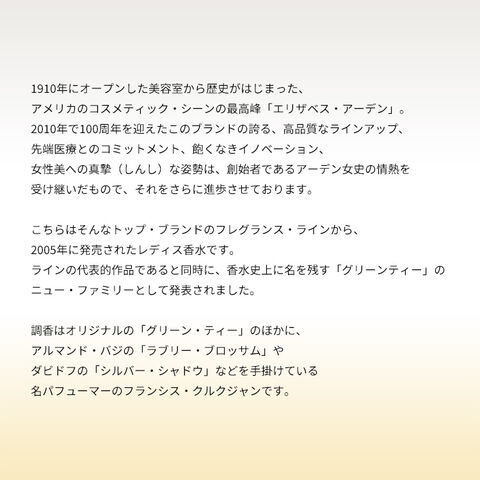 こちらはそんなトップ・ブランドのフレグランス・ラインから、2005年に発売されたレディス香水です。ラインの代表的作品であると同時に、香水史上に名を残す「グリーンティー」のニュー・ファミリーとして発表されました。フルーティー・フローラルの、解放感と美しさをかねそなえた香調をベースにしていて、気分をスッとリフレッシュしてくれるような、ナチュラル・リラクシンなアイテムに仕上がっております。