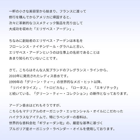 アーデン香水はどれもそうですが、こちらもマテリアルのオーガニック・エッセンシャル・オイルにこだわったハイクラスなアイテムで、特にラベンダーの香料は、世界的な香料会社「ギヴォーダン社」の、厳密な基準にもとづくブルガリア産オーガニック・ラベンダー・オイルを使用しております。