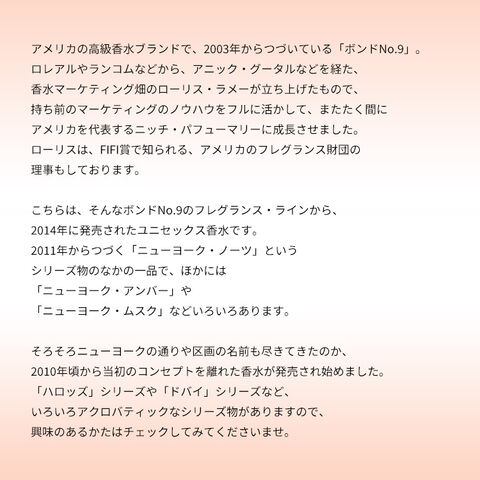 2011年からつづく「ニューヨーク・ノーツ」というシリーズ物のなかの一品で、ほかには「ニューヨーク・アンバー」や「ニューヨーク・ムスク」などいろいろあります。