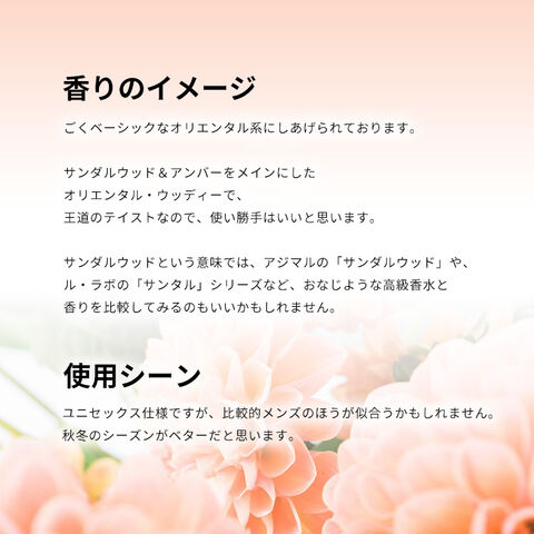 サンダルウッド&アンバーをメインにしたオリエンタル・ウッディーで、王道のテイストなので、使い勝手はいいと思います。ユニセックス仕様ですが、比較的メンズのほうが似合うかもしれません。秋冬のシーズンがベターだと思います。