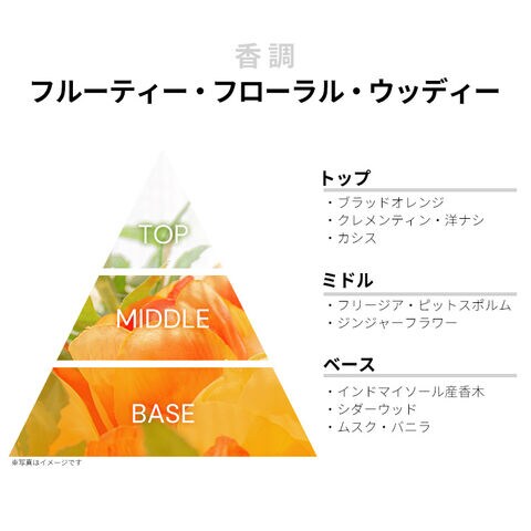 ブラッドオレンジ、ブラックカラント、クレメンタイン、ペア(洋ナシ)などが、メロウなシトラス・フルーティーを香り立たせるトップから、