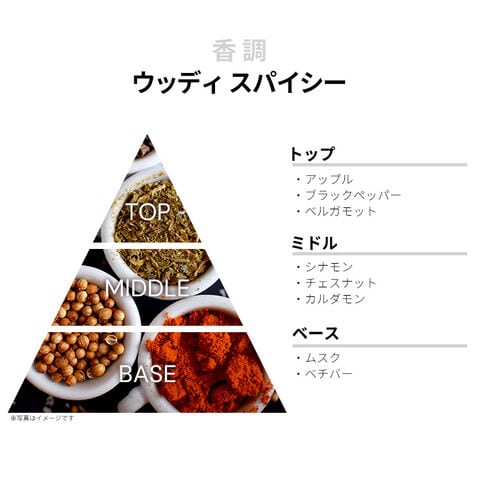 アップル、ベルガモット、ブラックペッパーなどが、マイルドなフルーティー・スパイシー・スウィートを香り立たせるトップから、