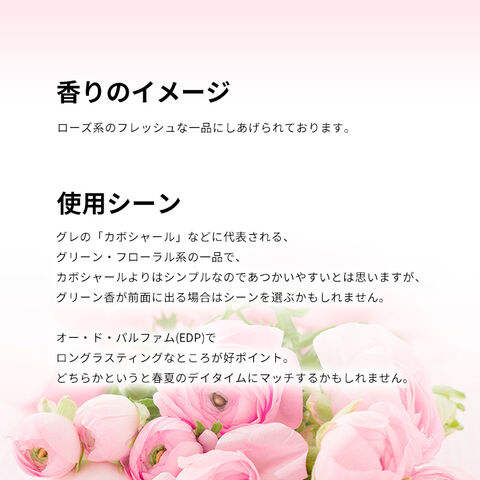 グレの「カボシャール」などに代表される、グリーン・フローラル系の一品で、カボシャールよりはシンプルなのであつかいやすいとは思いますが、グリーン香が前面に出る場合はシーンを選ぶかもしれません。