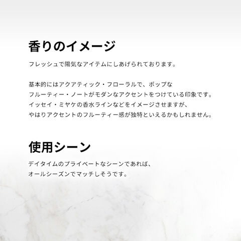基本的にはアクアティック・フローラルで、ポップなフルーティー・ノートがモダンなアクセントをつけている印象です。イッセイ・ミヤケの香水ラインなどをイメージさせますが、やはりアクセントのフルーティー感が独特といえるかもしれません。