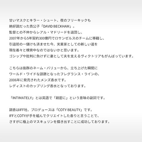 「INTIMATELY」とは英語で「親密に」という意味の副詞です。マイルド且つダンディーなシトラス・スパイシー・ウッディーの香調をベースにしており、オーソドックスな香りながらも深みがあり飽きの来ない、なかなか完成度の高いアイテムに仕上げられております。