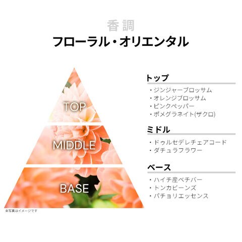 ジンジャー・ブロッサム、オレンジ・ブロッサム、ピンクペッパー、ポメグラネイト(ザクロ)などが、エキゾチックなフローラル・スパイシーを香り立たせるトップから、