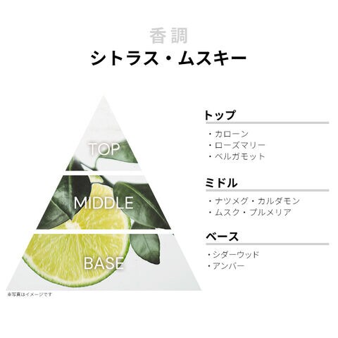 カローン、ローズマリー、ベルガモットなどが、すっきりとした爽快なシトラス・ハーバルを香り立たせるトップから、