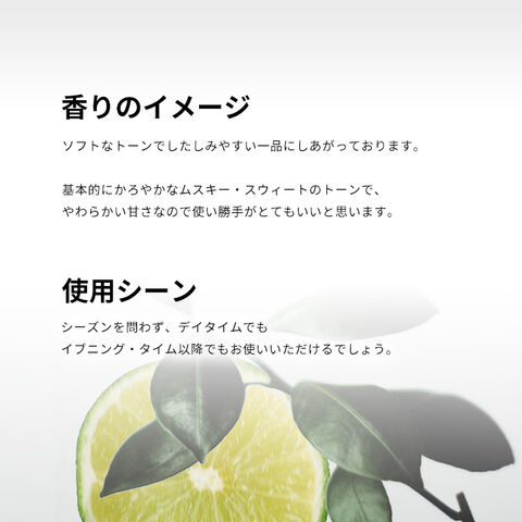 香りは、ふんわりとしたシトラス・ムスキーの香調がベース。ソフトなトーンでしたしみやすい一品にしあがっております。