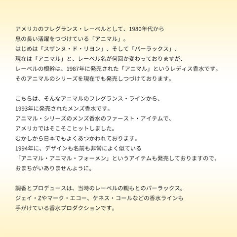 こちらは、そんなアニマルのフレグランス・ラインから、1993年に発売されたメンズ香水です。アニマル・シリーズのメンズ香水のファースト・アイテムで、アメリカではそこそこヒットしました。むかしから日本でもよくあつかわれております。
