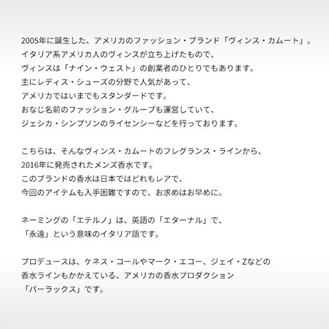 こちらは、そんなヴィンス・カムートのフレグランス・ラインから、2016年に発売されたメンズ香水です。このブランドの香水は日本ではどれもレアで、今回のアイテムも入手困難ですので、お求めはお早めに。