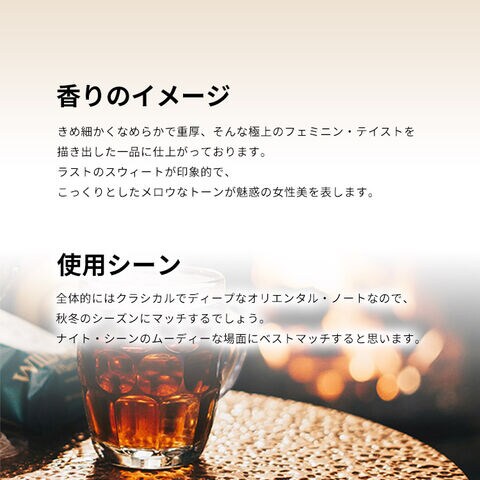 調香は、バーバリーの「ロンドン」やキャシャレルの「アモール・アモール」、カルバン・クラインの「ユーフォリア」などの傑作で知られる、マエストロのドミニク・ロピオン。プロデュースは、セルジオ・タッキーニやラ・ペルラなどの香水ラインも手がけていた「MORRIS PROFUMI」です。ラストのスウィートが印象的で、こっくりとしたメロウなトーンが魅惑の女性美を表します。全体的にはクラシカルでディープなオリエンタル・ノートなので、秋冬のシーズンにマッチするでしょう。ナイト・シーンのムーディーな場面にベストマッチすると思います。