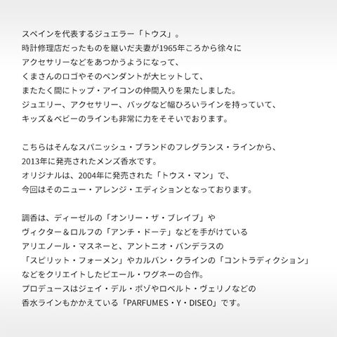こちらはそんなスパニッシュ・ブランドのフレグランス・ラインから、2013年に発売されたメンズ香水です。オリジナルは、2004年に発売された「トウス・マン」で、今回はそのニュー・アレンジ・エディションとなっております。インテンス(濃い)ヴァージョンという名前ですが、香りは焼き回しではなく、クラシカルなアロマティック・フゼアの香調がベース。スキのない洗練された男性像を描き出す、ナイスな一品に仕上げられております。