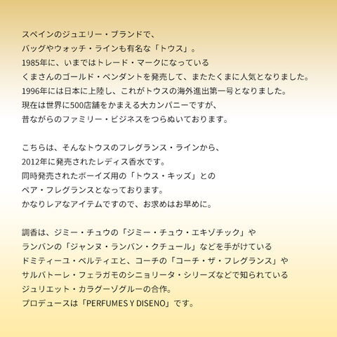 こちらは、そんなトウスのフレグランス・ラインから、2012年に発売されたレディス香水です。同時発売されたボーイズ用の「トウス・キッズ」とのペア・フレグランスとなっております。かなりレアなアイテムですので、お求めはお早めに。