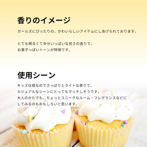 とても明るくて幸せいっぱいな甘さの香りで、お菓子っぽいトーンが特徴です。キッズ仕様なのでさっぱりとライトな香りで、カジュアルなシーンにとってもマッチしそうです。大人のかたでも、ちょっとユニークなルーム・フレグランスなどにしてみるのもおもしろいと思います。