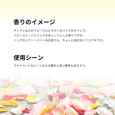 ラストはホワイト・ムスク、バニラ、トンカビーンズ、アンブロキサンなどが、メロウなムスキー・スウィートを香らせて、ロマンチックなセンシュアリティーをアピールしてくれそうです。
