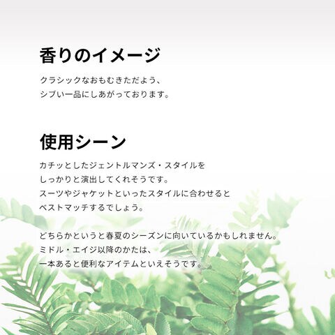 そつのないアロマティック・フゼア系の作品で、カチッとしたジェントルマンズ・スタイルをしっかりと演出してくれそうです。スーツやジャケットといったスタイルに合わせるとベストマッチするでしょう。