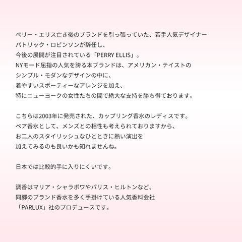 調香はマリア・シャラポワやパリス・ヒルトンなど、同郷のブランド香水を多く手掛けている人気香料会社「PARLUX」社のプロデュースです。エキゾチックであって、マニッシュなアクティビティーも感じさせる、完成度の高い香りだと思います。ペア香水として、メンズとの相性も考えられておりますから、お二人のスタイリッシュなひとときに熱い演出を加えてみるのも良いかも知れませんね。いずれにせよ、オールシーズンのカジュアル・シーン向きです。デイでもイブニング以降でも貴女次第です。スリムなボトルもカラーが映える良いデザインです。日本では比較的手に入りにくいです。