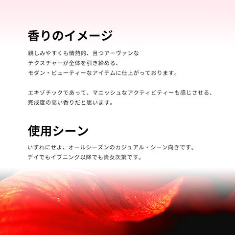 こちらは2003年に発売された、カップリング香水のレディスです。くっきりとしたレッド・カラーのボトルのデザインからもイメージできる通り、「レッド」の持つパッショネイトな情感を閉じ込めたフローラル・フレッシュ・ウッディーの香調をベースにしており、親しみやすくも情熱的、且つアーヴァンなテクスチャーが全体を引き締める、モダン・ビューティーなアイテムに仕上がっております。スパークリング・オレンジ・リーフ、プラム・エッセンス、シクラメンなどが、フレッシュ&ゼスティーなルミナス・フローラルを香り立たせるトップから、デュウイ・ハワイアン・オーキッド、オレンジ・フラワー、ミモザ・ミングル、シアー・ジャスミンなどが、ウルトラ・フェミニンなイレジスティブル・フローラル・ブーケを匂い咲かせるミドルへ。ラストはシアー・ウッド、アンバー、タクタイル・ムスク・アコードなどが、上品でありながら快活な印象のスウィートを奏で、セダクティブでホットな、レッド・ウーマンズ・センシュアリティーをアピールしてくれそうです。