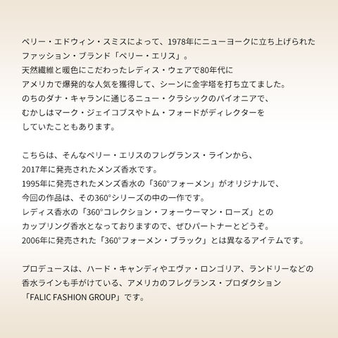 レディス香水の「360°コレクション・フォーウーマン・ローズ」とのカップリング香水となっておりますので、ぜひパートナーとどうぞ。2006年に発売された「360°フォーメン・ブラック」とは異なるアイテムです。