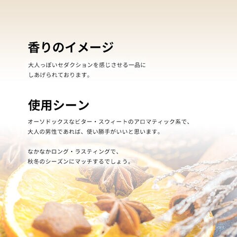 オーソドックスなビター・スウィートのアロマティック系で、大人の男性であれば、使い勝手がいいと思います。なかなかロング・ラスティングで、秋冬のシーズンにマッチするでしょう。