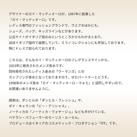 こちらは、そんなガイ・マッティオーロのフレグランス・ラインから、2003年に発売されたメンズ香水です。同時発売されたレディス香水の「ウーマンズ」とのカップリング香水となっておりますので、ぜひパートナーとどうぞ。1998年のメンズ香水の「ガイ・マッティオーロ・ウォモ」と混同しやすいので、おまちがいありませんように。