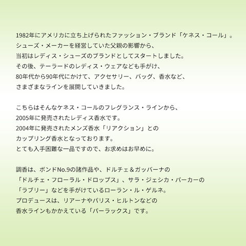 こちらはそんなケネス・コールのフレグランス・ラインから、2005年に発売されたレディス香水です。2004年に発売されたメンズ香水「リアクション」とのカップリング香水となっております。とても入手困難な一品ですので、お求めはお早めに。