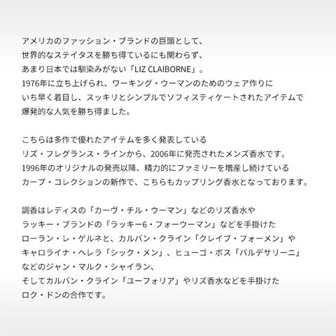 1996年のオリジナルの発売以降、精力的にファミリーを増産し続けているカーブ・コレクションの新作で、こちらもカップリング香水となっております。なかなか個性的なフゼア・ウッディーの香調をベースにしており、洒落っ気と深みのある、アーヴァンな男らしさをシャープに演出してくれそうなアイテムに仕上げられております。
