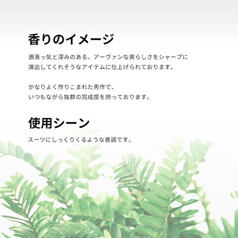 ラストはカルダモン、ベチバー、サンダルウッド、ムスクなどが、最後までシャープネスを損なわないスウィートで身体を包み込み、プライヴェートでも気を抜かない、パーフェクトなセンシュアリティーをアピールしてくれそうです。