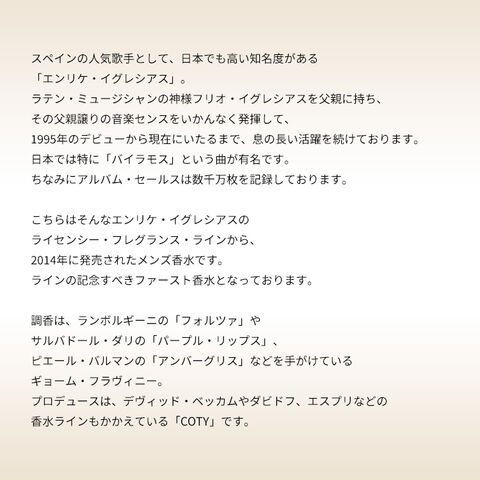 こちらはそんなエンリケ・イグレシアスのライセンシー・フレグランス・ラインから、2014年に発売されたメンズ香水です。ラインの記念すべきファースト香水となっております。香りはホットでパワフルなアロマティック・ウッディーの香調がベース。ラテンな息吹を感じさせる、ウェルメイドな一品に仕上げられております。