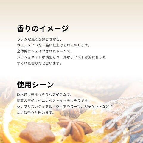 ラストはトンカビーンズ、シダーウッド、レザー・アコードなどが、大人っぽく洗練されたスウィートをただよわせて、たよりがいのあるセクシーなマスキュリニティーを際立たせてくれそうです。