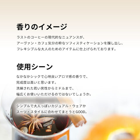 ラベンダー、ベルガモット、グリーン・ノートなどが、スッキリと爽快でナチュラルなシトラス&グリーンを香り立たせるトップから、シダーやジャスミンなどが、テンダーであか抜けたマスキュリン・フローラルを沸き立たせるミドルへ。ラストはアンバー、コーヒー・モカ、サンダルウッド、パチョリなどが、ビター・スウィートの男らしいジェントルな香りを浮かび上がらせ、しなやかに快活に都会を生きる、ハイポジションなあなたの男性的セダクティヴィティーを柔らかく演出してくれそうです。