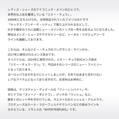オリジナルは、2014年に発売された、ジミー・チュウ初のメンズ香水「ジミー・チュウ・マン」で、今回はそのシリーズのニュー・ファミリーとなっております。ヨーロッパではそれなりにヒットしましたが、日本ではあまり見かけないレアなアイテムとなっておりますので、お求めはお早めに。