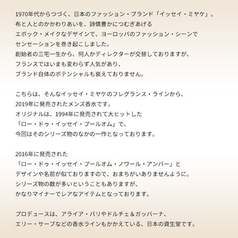 2016年に発売された「ロー・ドゥ・イッセイ・プールオム・ノワール・アンバー」とデザインや名前が似ておりますので、おまちがいありませんように。シリーズ物の数が多いということもありますが、かなりマイナーでレアなアイテムとなっております。