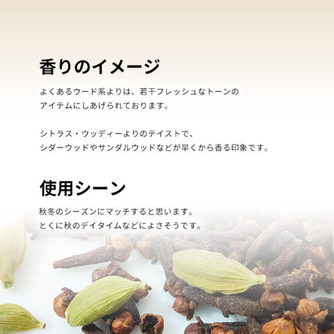シトラス・ウッディーよりのテイストで、シダーウッドやサンダルウッドなどが早くから香る印象です。秋冬のシーズンにマッチすると思います。とくに秋のデイタイムなどによさそうです。