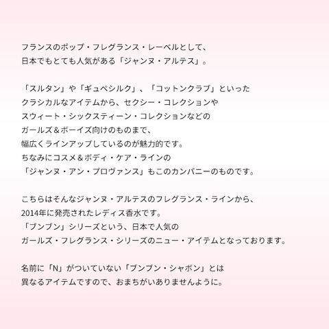 こちらはそんなジャンヌ・アルテスのフレグランス・ラインから、2014年に発売されたレディス香水です。「ブンブン」シリーズという、日本で人気のガールズ・フレグランス・シリーズのニュー・アイテムとなっております。名前に「N」がついていない「ブンブン・シャボン」とはことなるアイテムですので、おまちがいありませんように。香りはオーソドックスでベーシックなキュートさを持った、ガーリーなテイストのフルーティー・フローラルの香調がベース。カジュアルなシーンで気軽にまとえる、ユースフルな一品にしあげられております。