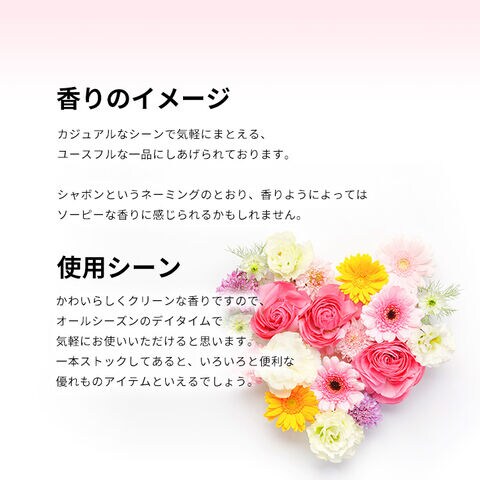 シャボンというネーミングのとおり、香りようによってはソーピーな香りに感じられるかもしれません。かわいらしくクリーンな香りですので、オールシーズンのデイタイムで気軽にお使いいただけると思います。一本ストックしてあると、いろいろと便利な優れものアイテムといえるでしょう。