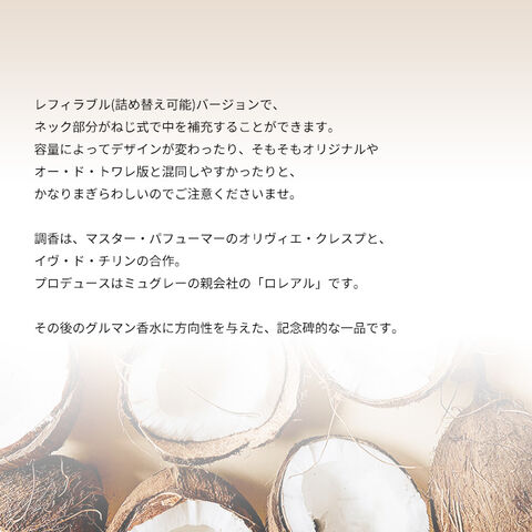 調香は、マスター・パフューマーのオリヴィエ・クレスプと、イヴ・ド・チリンの合作。プロデュースはミュグレーの親会社の「ロレアル」です。