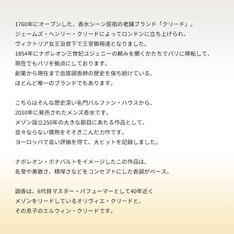 こちらはそんな歴史深い名門パルファン・ハウスから、2010年に発売されたメンズ香水です。メゾン設立250年の大きな節目にあたる作品として、並々ならない情熱をそそぎこんだ力作です。ヨーロッパで高い評価を得て、大ヒットを記録しました。ナポレオン・ボナパルトをイメージしたこの作品は、名誉や勇敢さ、精悍さなどをコンセプトにしたシプレー・フルーティーの香調がベース。ナポレオンというモチーフから思い描くようなクラシックなテイストがほとんどない、ジェントル・スポーティーな一品に仕上がっております。