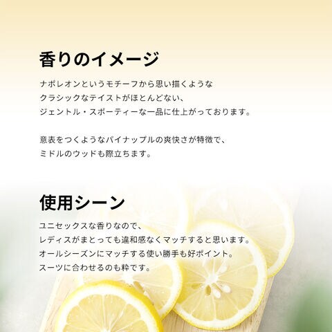 調香は、6代目マスター・パフューマーとして40年近くメゾンをリードしているオリヴィエ・クリードと、その息子のエルウィン・クリードです。意表をつくようなパイナップルの爽快さが特徴で、ミドルのウッドも際立ちます。ユニセックスな香りなので、レディスがまとっても違和感なくマッチすると思います。オールシーズンにマッチする使い勝手も好ポイント。スーツに合わせるのも粋です。