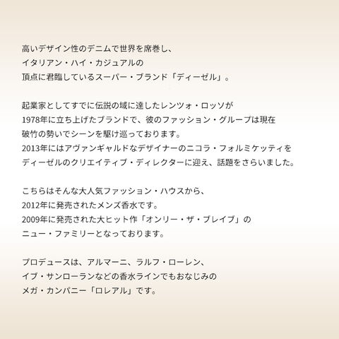 プロデュースは、アルマーニ、ラルフ・ローレン、イブ・サンローランなどの香水ラインでもおなじみのメガ・カンパニー「ロレアル」です。基本的にはアップル&ラブダナム(樹脂)がメインとして香る印象で、マイルドでテイスティ、優雅で知的な男性像を引きだします。ソツがない作り込みはさすがのディーゼル・クオリティ。秋冬のプライヴェート・シーンでデイリー・ユースできるスグレモノです。