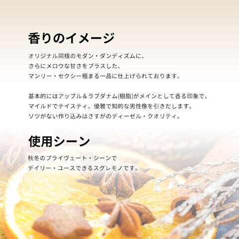 ラストはアンバーウッド、ベンゾイン、パチョリ、タバコ・リーフなどが、ジェントルで厚みのあるウッディー・タバコ・アロマティックを漂わせて、大人の男性らしい奥深いセダクションをしっかりと際立たせてくれそうです。