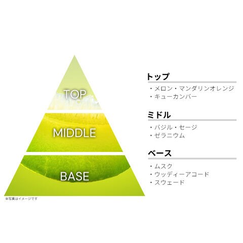 メロン、マンダリン・オレンジ、キューカンバーなどが、アクアティックでトランスペアレントなウォータリー・フルーティーを香り立たせるトップから、