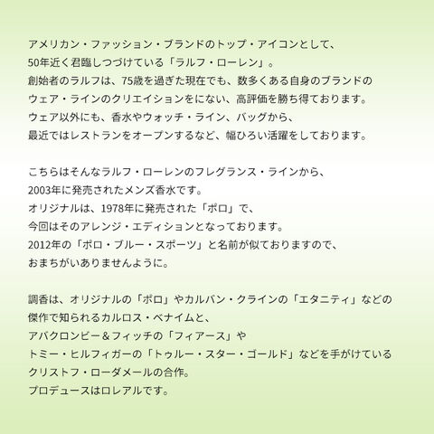こちらはそんなラルフ・ローレンのフレグランス・ラインから、2003年に発売されたメンズ香水です。オリジナルは、1978年に発売された「ポロ」で、今回はそのアレンジ・エディションとなっております。2012年の「ポロ・ブルー・スポーツ」と名前が似ておりますので、おまちがいありませんように。オリジナルはクラシカル・シプレーのエヴァー・グリーンですが、このアレンジ版は、モダンなアロマティック・フゼアの代名詞ような作品で、オリジナルと変わらないくらい人気があります。みずみずしいトーンが、ポロというネーミングにふさわしい、スポーティブなマスキュリンを描き出す、そんな一品にしあげられております。