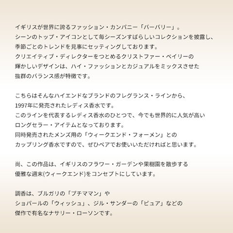 こちらはそんなハイエンドなブランドのフレグランス・ラインから、1997年に発売されたレディス香水です。このラインを代表するレディス香水のひとつで、今でも世界的に人気が高いロングセラー・アイテムとなっております。同時発売されたメンズ用の「ウィークエンド・フォーメン」とのカップリング香水ですので、ぜひペアでお使いいただければと思います。イギリスのフラワー・ガーデンや果樹園を散歩する優雅な週末(ウィークエンド)をコンセプトにしたこの作品は、ふんわりとなめらかなフルーティー・フローラルの香調がベース。ハートフルでほっと一息つくようなフェミニンと、チャーミングで明るいセンシュアリティーをあわせもつ、極上の一品に仕上げられております。