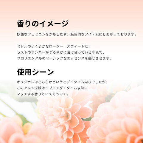 香りは、オリジナルよりもミニマルで、大人っぽい印象のフローラル・オリエンタルの香調がベース。妖艶なフェミニンをかもしだす、魅惑的なアイテムにしあがっております。