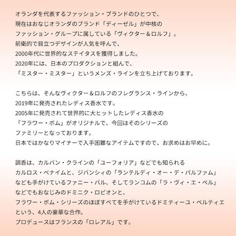 2005年に発売されて世界的に大ヒットしたレディス香水の「フラワー・ボム」がオリジナルで、今回はそのシリーズのファミリーとなっております。日本ではかなりマイナーで入手困難なアイテムですので、お求めはお早めに。