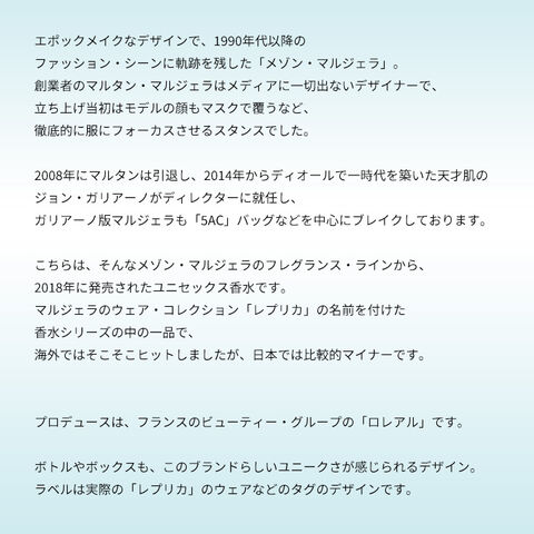 マルジェラのウェア・コレクション「レプリカ」の名前を付けた香水シリーズの中の一品で、海外ではそこそこヒットしましたが、日本では比較的マイナーです。