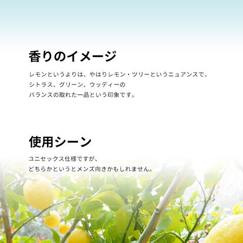 レモンというよりは、やはりレモン・ツリーというニュアンスで、シトラス、グリーン、ウッディーのバランスの取れた一品という印象です。ユニセックス仕様ですが、どちらかというとメンズ向きかもしれません。
