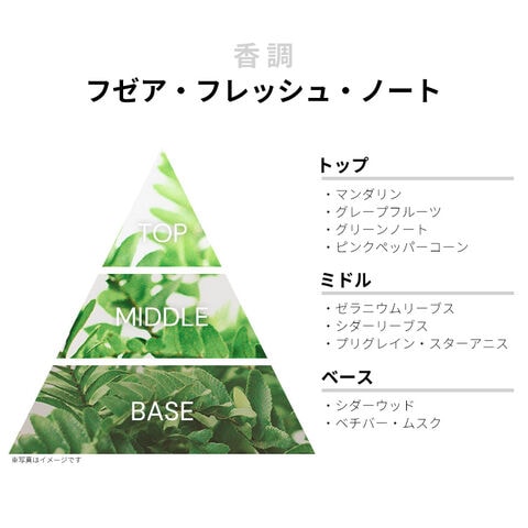 マンダリン、グレープフルーツ、グリーン・ノート、ピンク・ペッパー・コーンなどが、フレッシュでオープンなシトラス・グリーンを香り立たせるトップから、