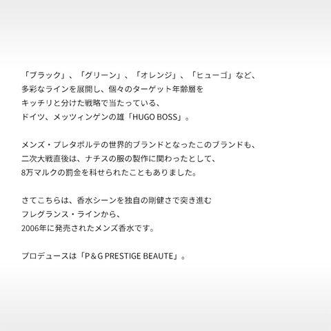 ボス・ラインらしい、カッチリとした硬質なデザインのボトルも、メタリック・グレーのカラーリングで妥協のない男らしさを思わせる、秀逸なデザインとなっております。このデザインは、同郷ドイツのデザイナー、ルッツ・ヘルマン(LUTZ HERRMANN)のものだそうです。